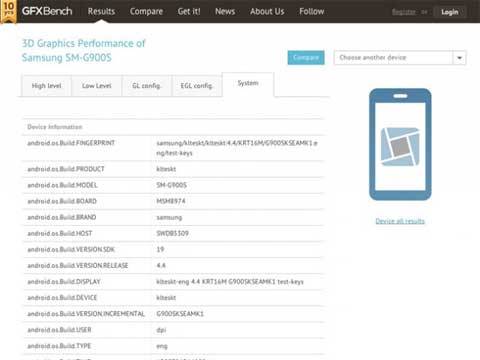 Thêm nữa, ETNews cũng cho biết Samsung Galaxy S5 cũng sẽ có 2 phiên bản gồm F-series và S-series tương ứng với 2 mẫu vỏ là nhôm nguyên khối, và vỏ nhựa. Điểm GFX Bench mới đây của mẫu thử nghiệm có số hiệu là Samsung SM-G900S đã xác nhận một số thông tin phần cứng của Galaxy S5 này. Chip xử lý trên mẫu thử nghiệm vẫn chỉ là Snapdragon 800 và chip đồ họa tích hợp Adreno 330 GPU, nhưng tốc độ xung nhịp được đẩy tới mức 2.46GHz. Tiếc rằng, không thấy xuất hiện của chip xử lý mới nhất Snapdragon 805 cùng chip đồ họa Adreno 420 GPU trên Samsung SM-G900S.